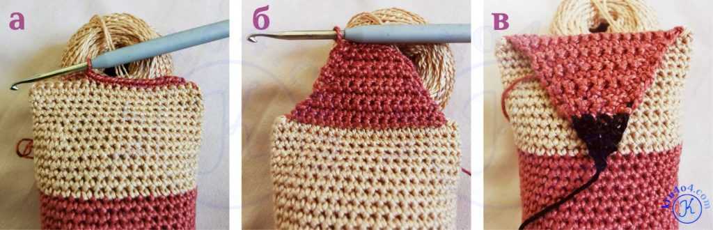 Далее вяжем столбиками без накида, уменьшая количество петель в ряду на одну с каждой стороны и в каждом ряду — фото б.