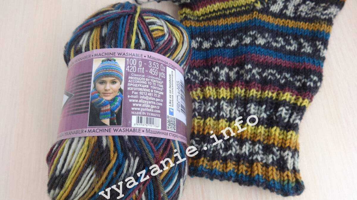 Пряжу я взяла ALIZE Superwash 100 г = 420 м, 75% шерсть, 25% полиамид. На этикетке написано «Машинная стирка». То есть, можно стирать в машинке. Производитель рекомендует спицы №2-4. Я вязала носочными спицами №3. Получились очень тоненькие, приятные, тянутся хорошо и в длину, и в ширину.