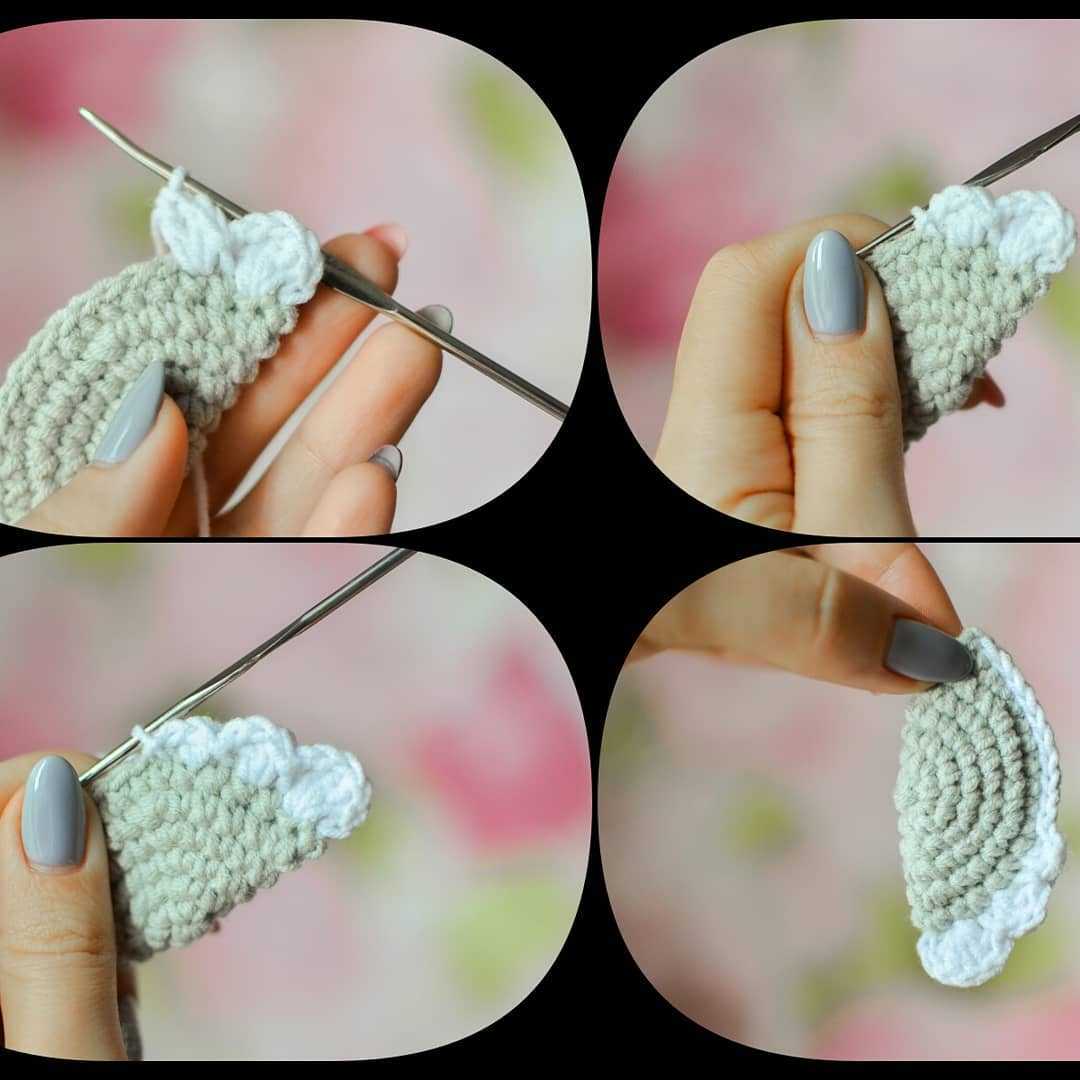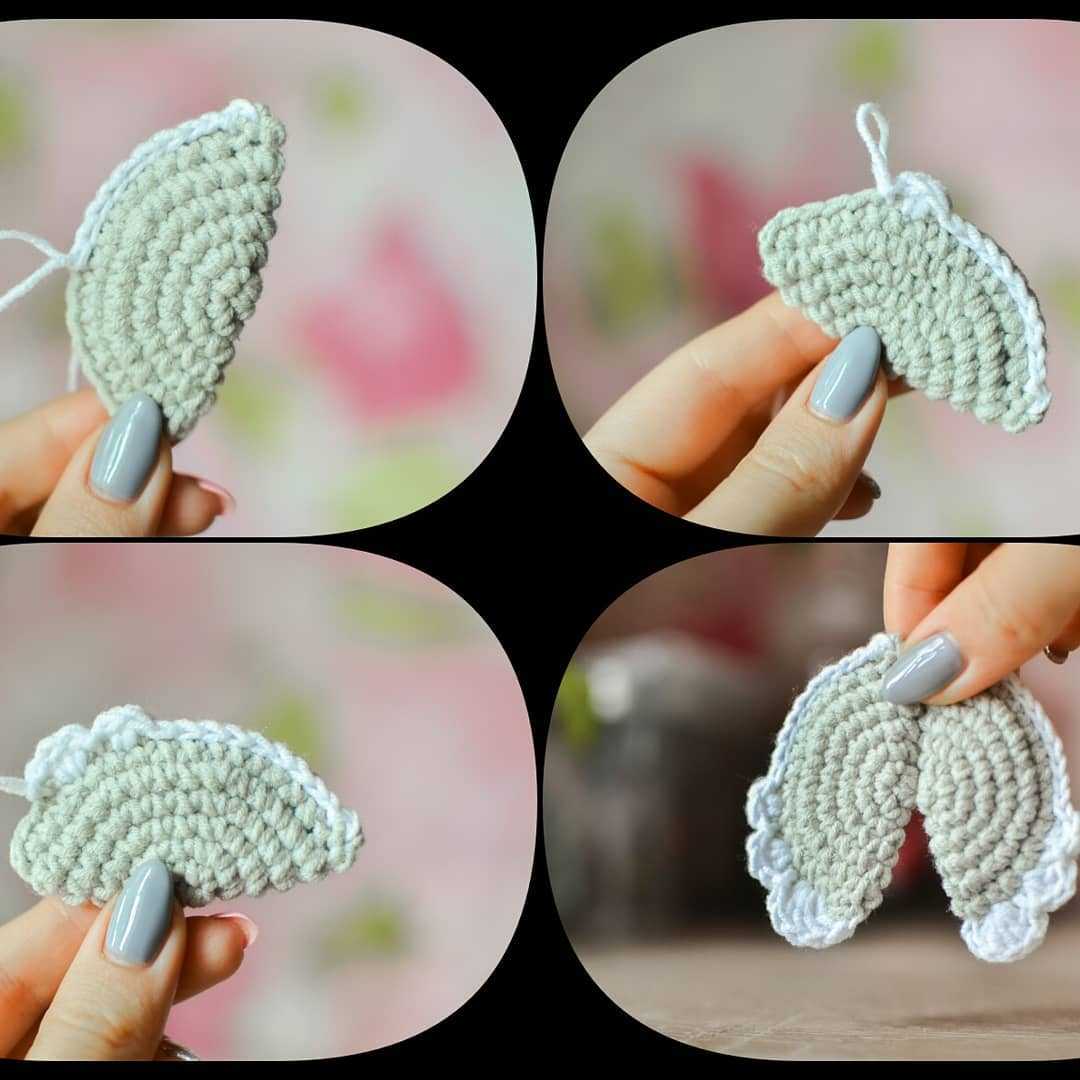 Крылья (2 детали) Светло-серой пряжей: 1: 6 сбн в кольцо амигуруми (6) 2: (пр)*6 (12) 3: (пр, 1 сбн)*6 (18) 4: (пр, 2 сбн)*6 (24) 5: (пр, 3 сбн)*6 (30) 6: (пр, 4 сбн)*6 (36) 7: складываем вязание стенка к стенке и провязываем за обе стенки примерно 18 сбн.