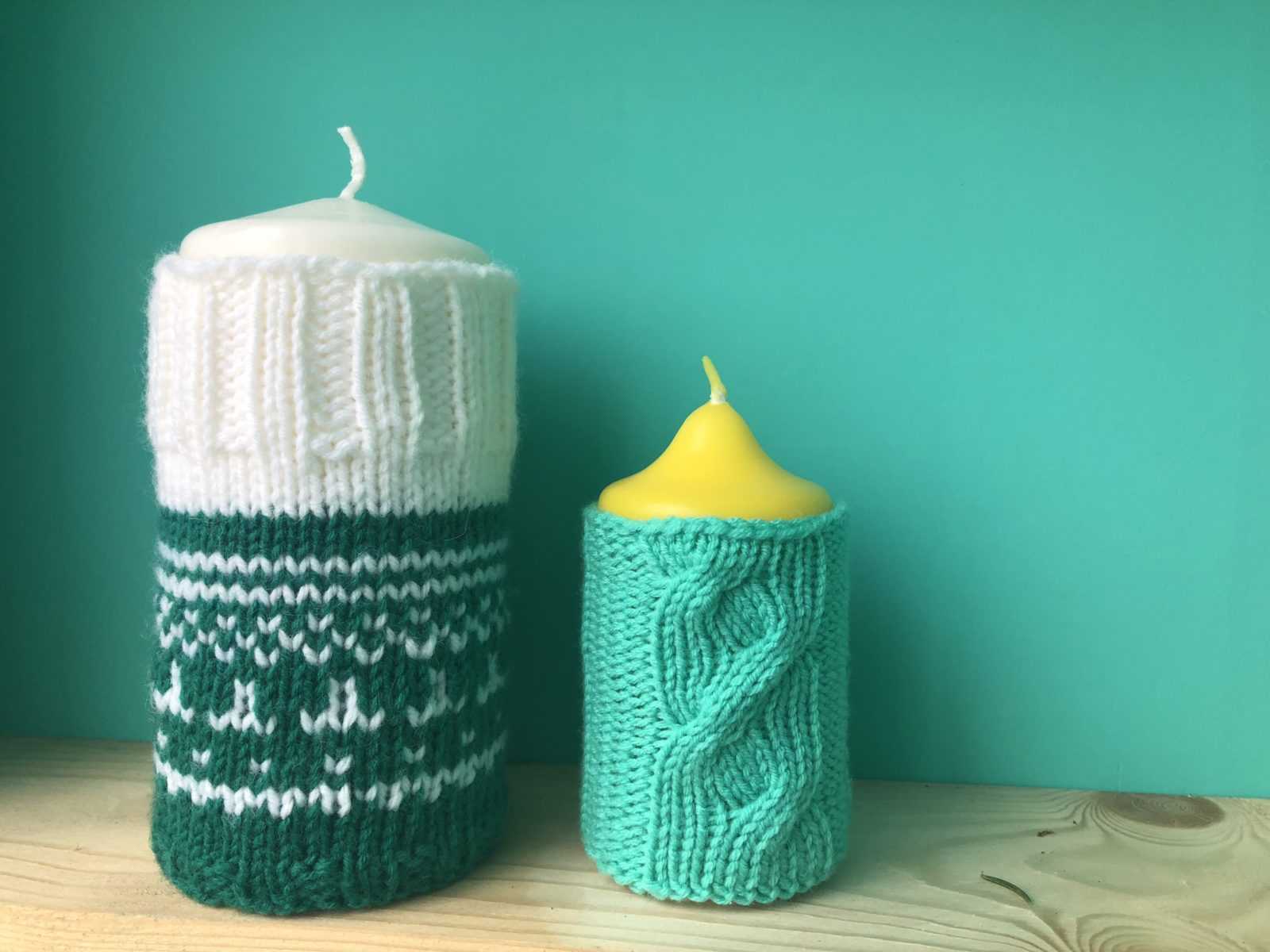 Готовые свечи в стеклянных подсвечниках продаются во многих магазинах. Да, они неплохо смотрятся сами по себе. Но если дополнить его вязаным чехлом – получится по-новогоднему сказочно. И такие свечи (в вязаном чехле) тоже продаются в сетевых супермаркетах. Но, конечно, handmade всегда выигрывает.