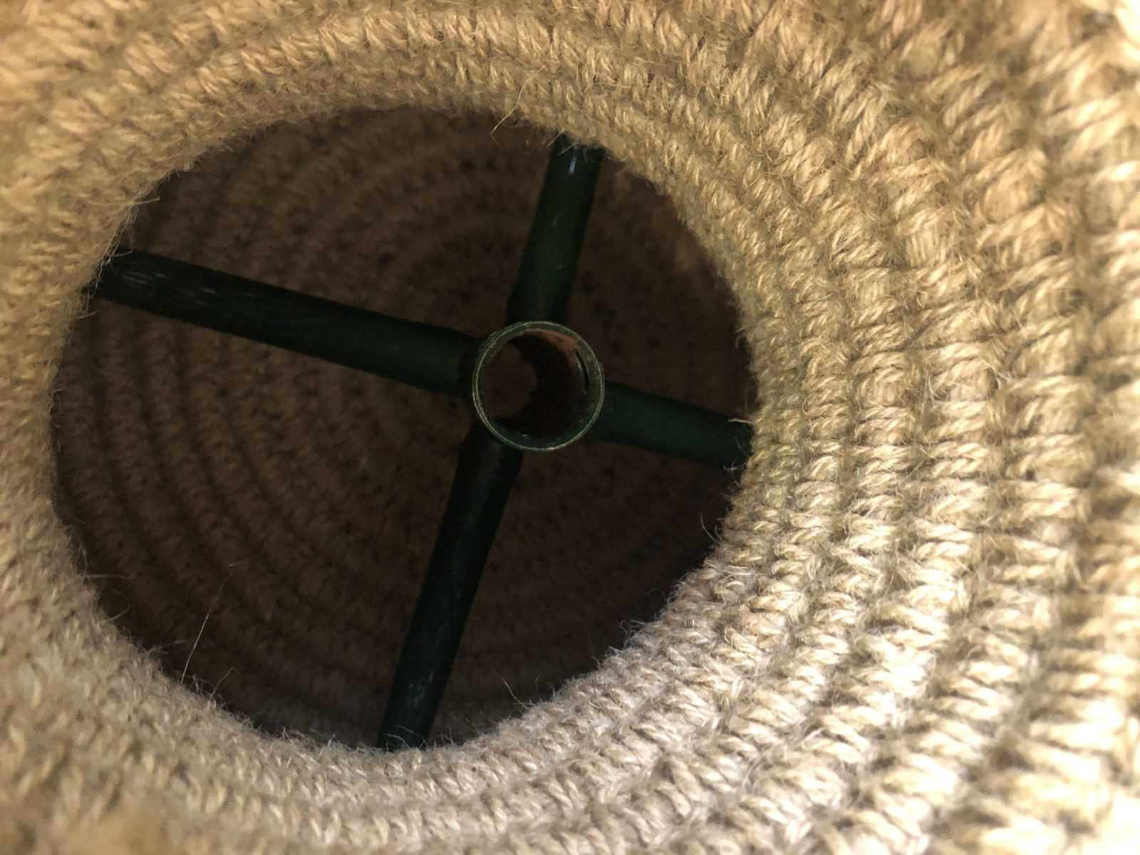 Необязательно обвязывать канат именно джутовой нитью, можно использовать любую. Но именно такое сочетание позволяет создать цельную корзину. С первого взгляда сложно догадаться, что корзина связана из двух нитей: каната и джута.