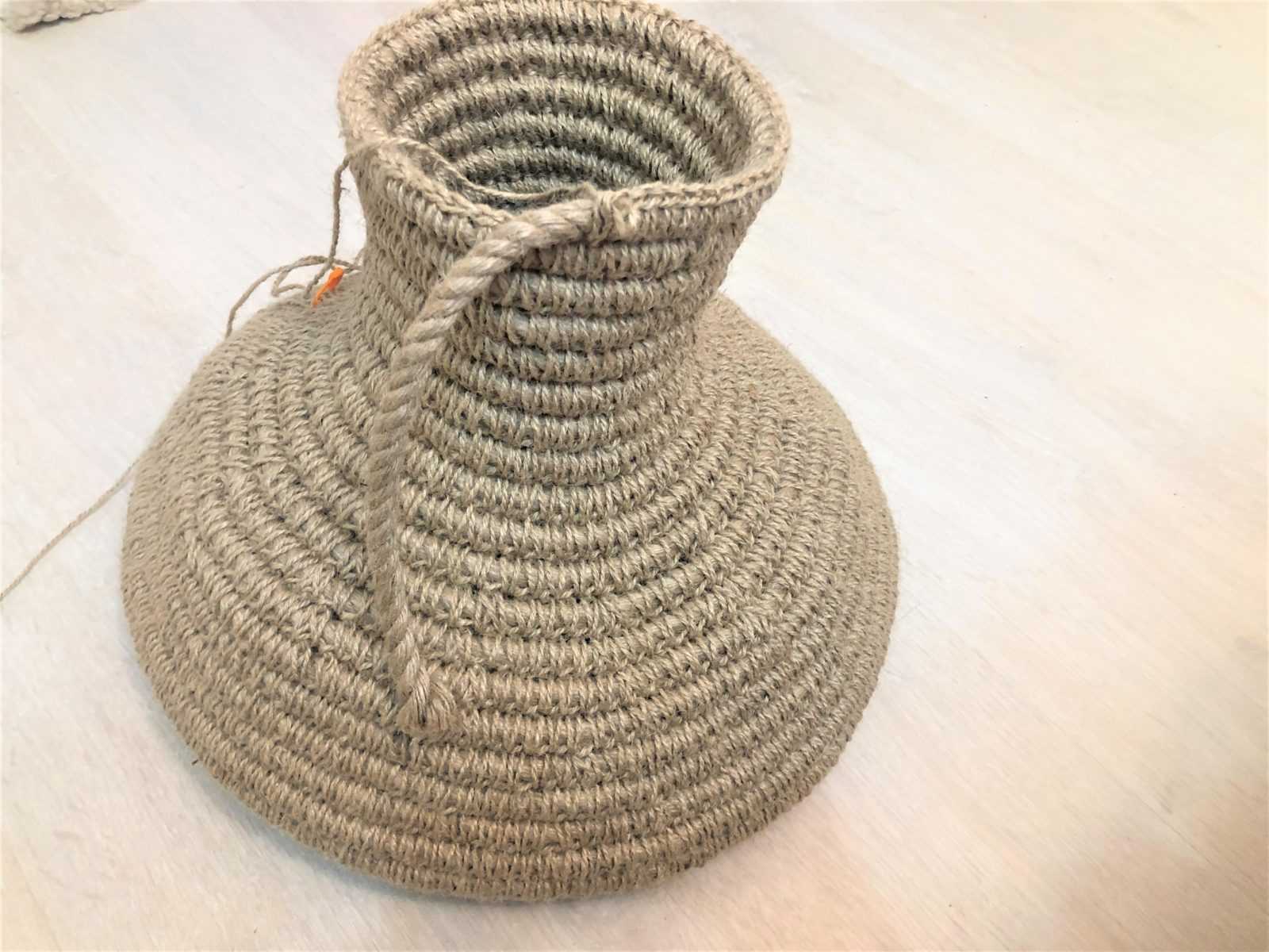 После того, как связана нужная высота, останется только обвязать корзину джутовой нитью, чтобы придать ей законченность: соединительными воздушными петлями как показано на видео: