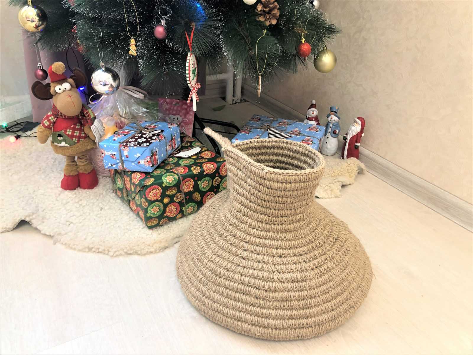 Диаметр вяжется ровно также по описанию выше. Но в этой корзине он у меня 35 сантиметров. Я померила ножки искусственной новогодней елки, их длина – около 30 см.
