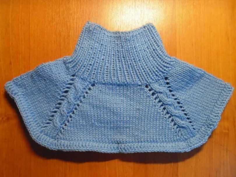 Такие теплые вязаные изделия носят поверх курточек, пальто, плащей. Ребенок может легко снять манишку — воротник, если станет жарко, не прибегая к помощи взрослых.