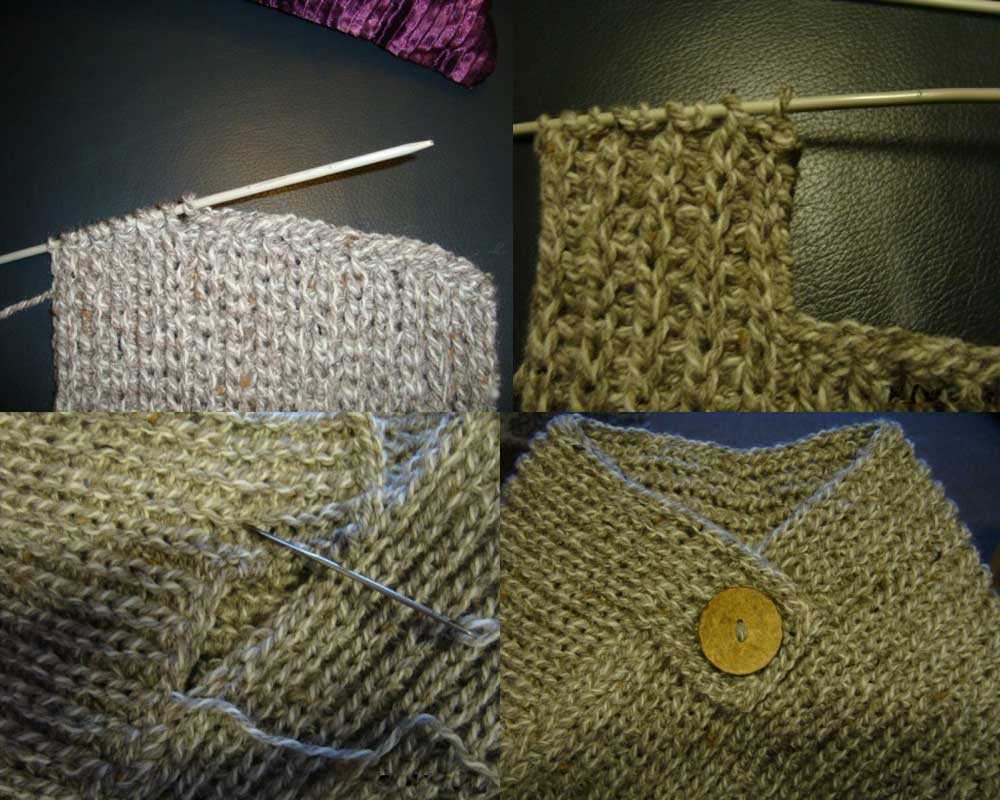 Наберите 28 п. и свяжите 7 р. платочным узором, затем 3 р. чулочной вязкой, в которой в изнаночном р. необходимо выполнить 4 отверстия для пуговиц: 3изнан., *2 п. вм. л., НК, 5изн.*, 4изнан. В лицев. р. накиды провязывайте лицевыми. Затем начните вязать укороченными рядами платочной вязкой. 1 и 2 р.: 15лиц., развернитесь; 3 и 4 р.: 19лиц., развернитесь; 5 и 6 р.: 28лиц.
