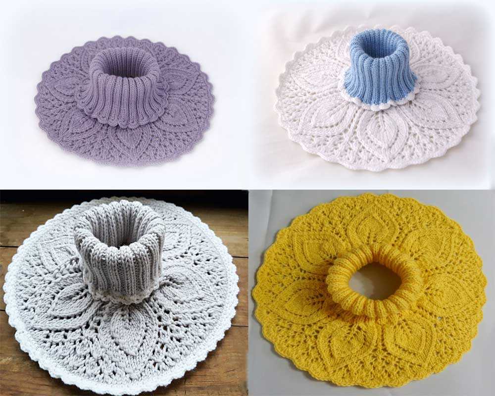 - Допускается выполнять круговое вязание. В этом случае, чаще всего реализуется ажурный узор, в каждом ряду которого увеличивается количество петель в соответствие с размером.