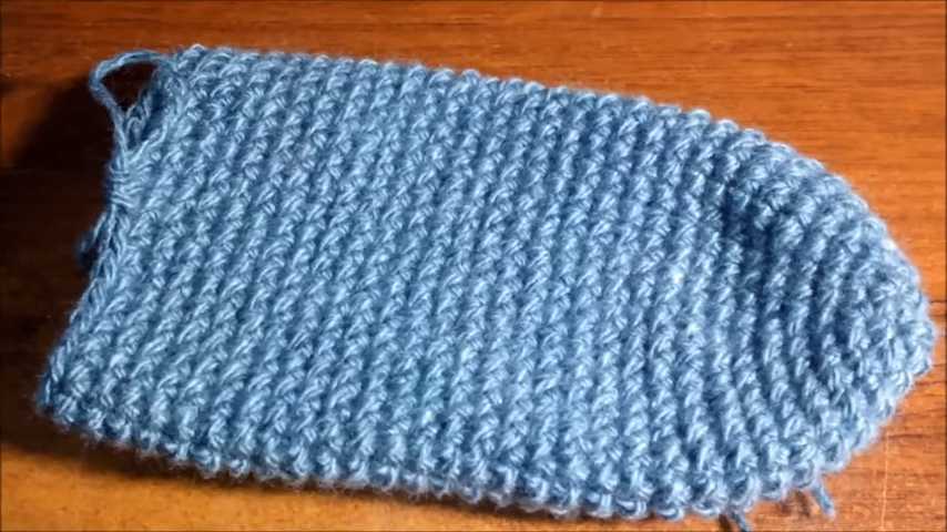 Далее резинка провязывается несколькими рядами из простой глади столбиков с одним накидом. В этой модели было использовано всего 17 рядов таких столбиков. Затем немного посложнее — это пяточка.