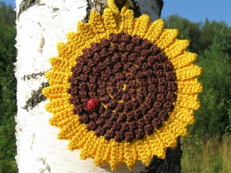 Цветок подсолнуха во все времена являлся самым теплым и солнечным узором, привносящим в дом радость и свет. Прихватка-цветок, как правило, используется при выполнении трудов в средиземноморском или кантри стиле. Колоритный аксессуар обладает выделяющейся центральной частью и приятной для глаза окантовкой.