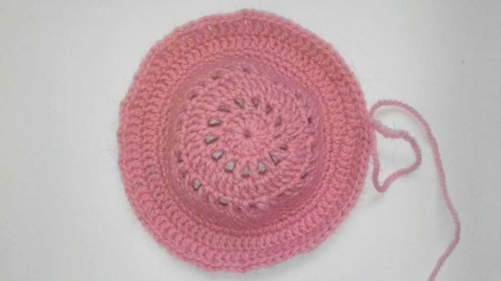 При желании можно связать 5-6 рядов, чтобы шляпка была поглубже. Если же хотите продеть в готовое изделие ленточку, то в последнем рядке тульи СБН я чередую с воздушными петлями.