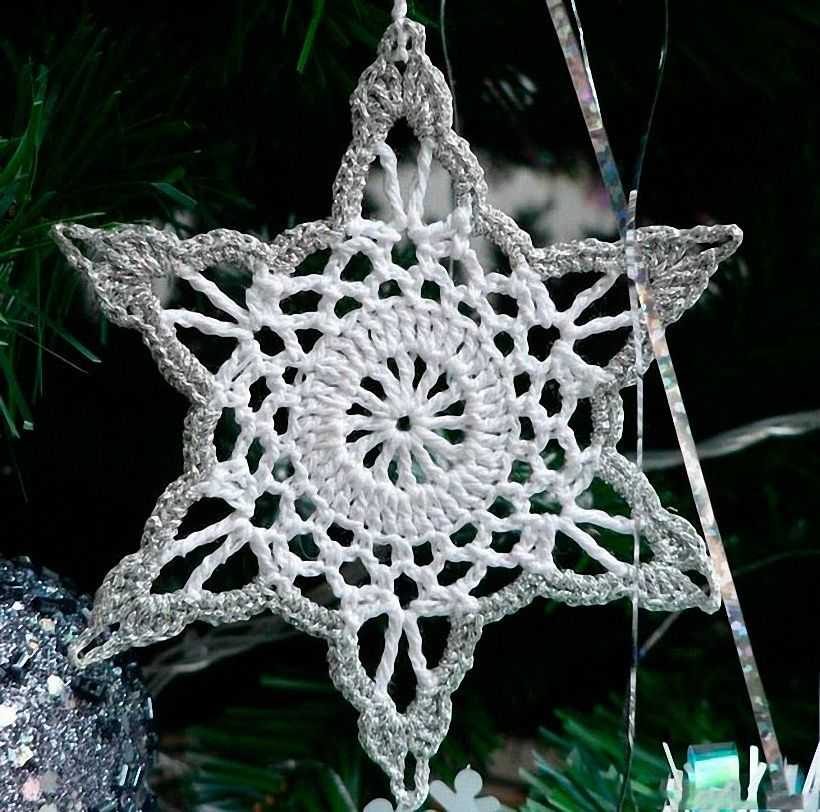 Свяжите ажурную снежинку из белых или цветных ниток. Это может быть простая схема из столбиков и соединений или сложная ажурная вязка