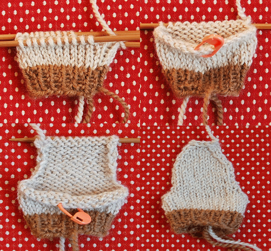 Резинка. Первый ряд – 1 лицевая петля (ЛП), 1 изнаночная петля (ИП), и так до конца. Провяжите так с первого по четвертый ряды. Используя спицы №4, провяжите так еще 7 рядов основным цветом пинеток.