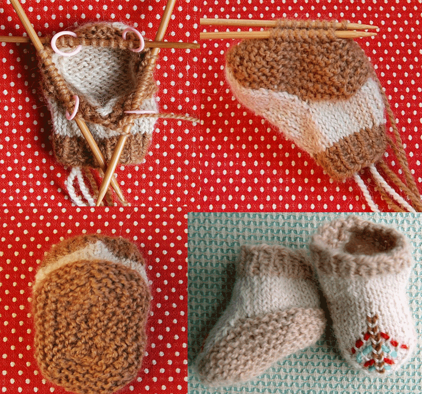 Этот вид почти не отличается от простого. Чаще всего их вяжут обычными нитками, а в качестве декора используют разные цвета, с помощью которых удается придать изделию вид ботинок. Существуют разные способы создания этого аксессуара как на спицах, так и крючком.