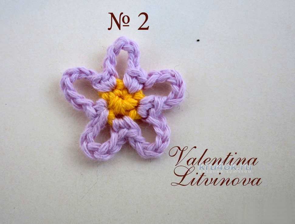 Вязаные цветы крючком – это красивые изделия, которые могут простыми или объемными. В этом уроке мы рассмотрим, как создать простой цветочек из пяти треугольных лепестков. Добавив количество петель, вы можете сделать цветок более объемным.