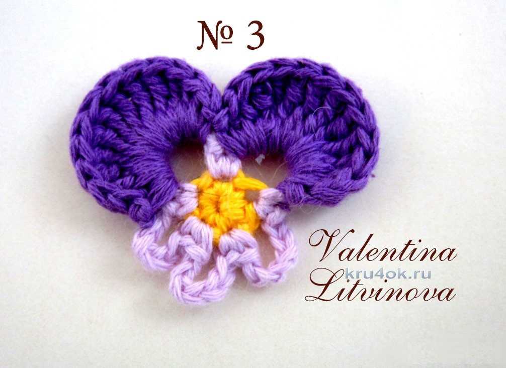 Продолжаете вязать ряд, как бы проходя поверх двух ушек. Опять задаете основу уже 3 ушкам, с таким же количеством петель — 15. Но вот используете 3 ст. б/н, а после идут ст. с/н, завершаете также простыми столбиками. Теперь переходите к другой нити. Делаете 3 в.п. для подъема и все ушки делаете из длинных столбиков с 2 накидами. Анютины глазки готовы! Главное — не забывайте чередовать разные цвета нити.