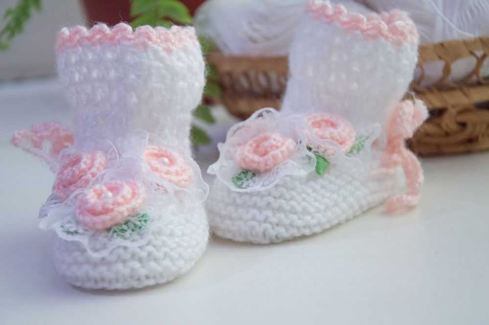 Из пряжи можно связать не только теплую или летнюю одежду, а и приятные к телу пинетки или носки ребенку. Вязание для детей от 0 до 3 лет – приятный процесс. Посмотрите, какую красоту можно получить из белой и розовой пряжи, если немного приложить усилий.