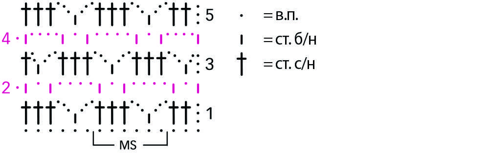 Теперь надо связать другую сторону колоса. Выполните вначале один ряд И.П., а второй — Л.П. Далее вяжите по представленной ниже схеме.