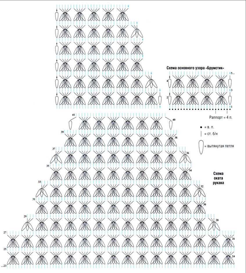 4-й — 27-й ряды: вязать согласно схеме основного узора «Брумстик». Каждый ряд заканчивать соединительным столбиком. Для оформления оката рукава в 28-м ряду оставить непровязанными 2 раппорта от контрольной точки, затем в каждом 2-м раппорте 4 раза по 1/2 раппорта. Далее работу продолжить согласно схеме оката рукава по 41-й ряд включительно. С обратной стороны основания цепочки присоединить новую нить и вязать по кругу 3 ряда столбиками без накида. Каждый ряд заканчивать соединительным столбиком.