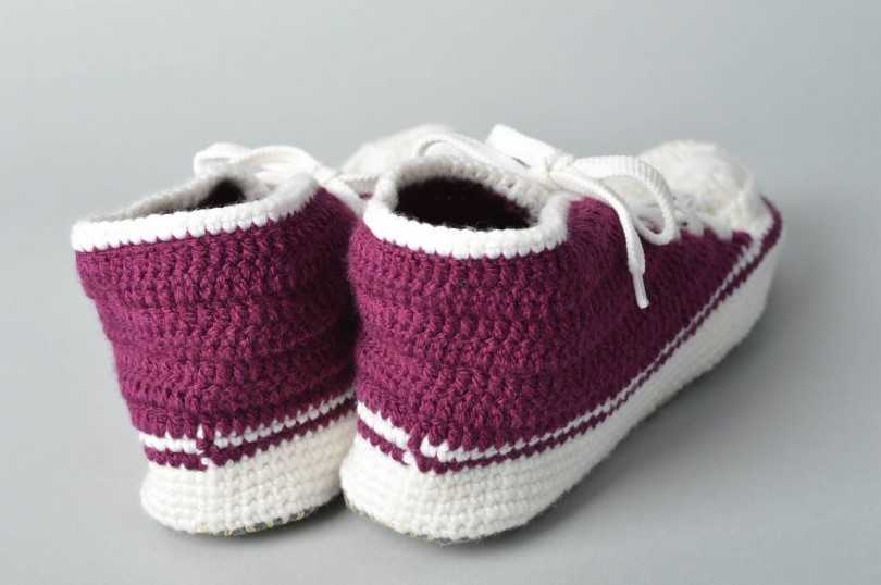 Середина верха должна быть совмещена с серединой носка. Скалываем и пришиваем все детали. Пришиваем нижнюю подошву из войлока или кожи. Вторую пару вяжем аналогично.