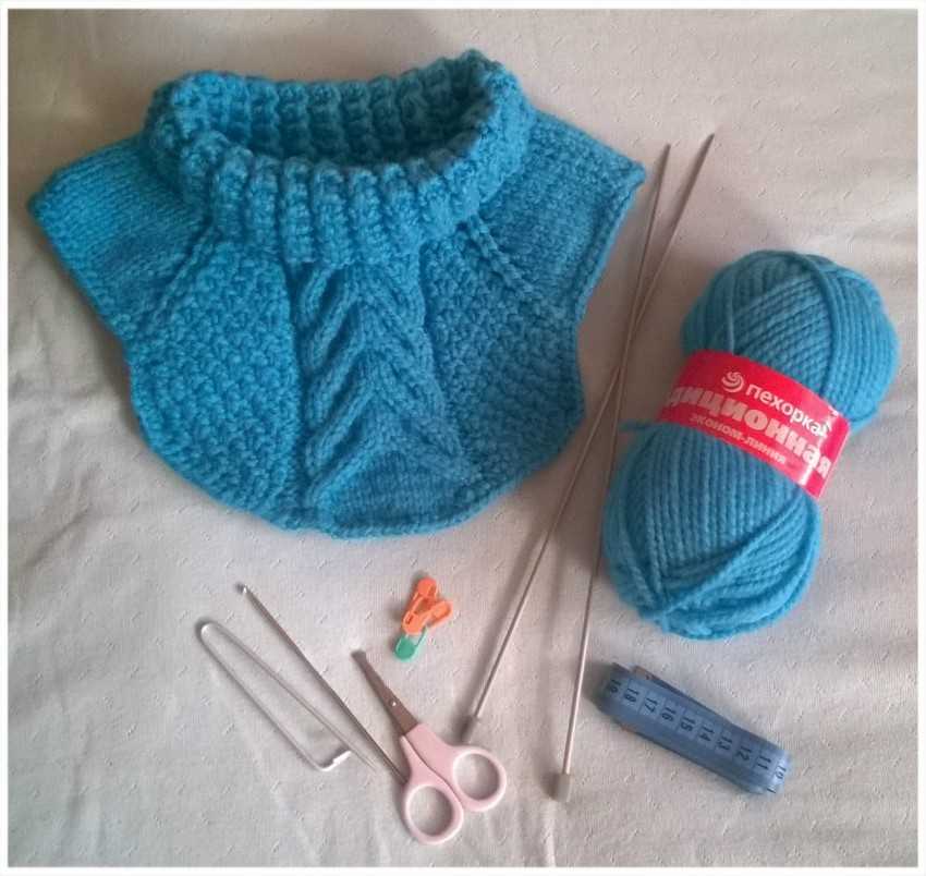 Первый этап – вязание горловины (ворота). Предварительно, к процессу вязания, подготовить спицы, пряжу и сантиметровую ленту. Следует учесть, что чем толще нить, тем меньше петель. Для манишки лучше всего подойдут нитки из шерсти с синтетическими волокнами. Вязаное изделие из них будет мягким и приятным на ощупь.