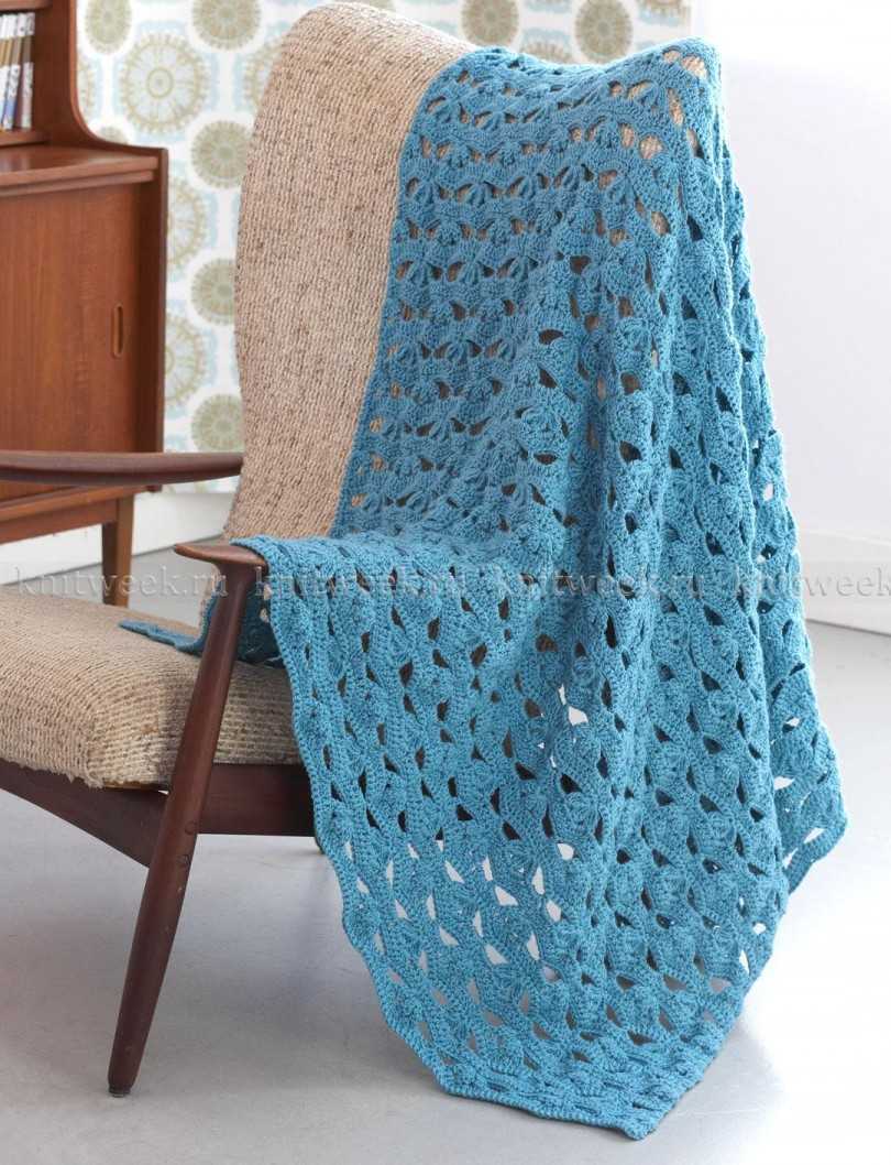 - Плед-накидка из специальной пряжи, где способ работы указан на упаковке мотков. В этом случае не нужно подбирать узор или способ вязки, есть подробная инструкция и фото изделия.