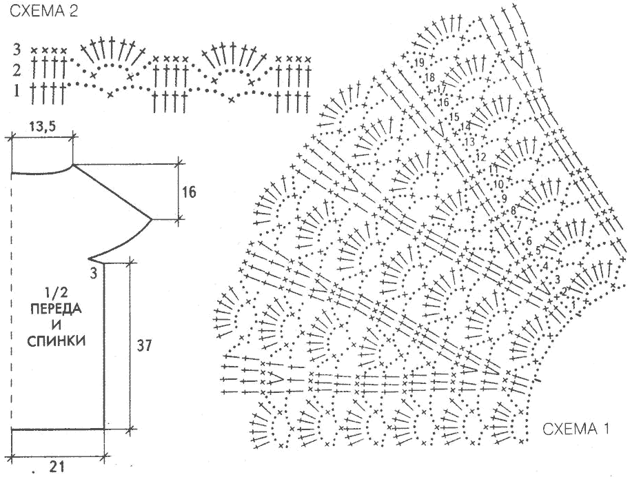Модель вяжется снизу, рассчитана на девочку 7 месяцев. Вязать сначала схему ракушек до проймы рукавов.