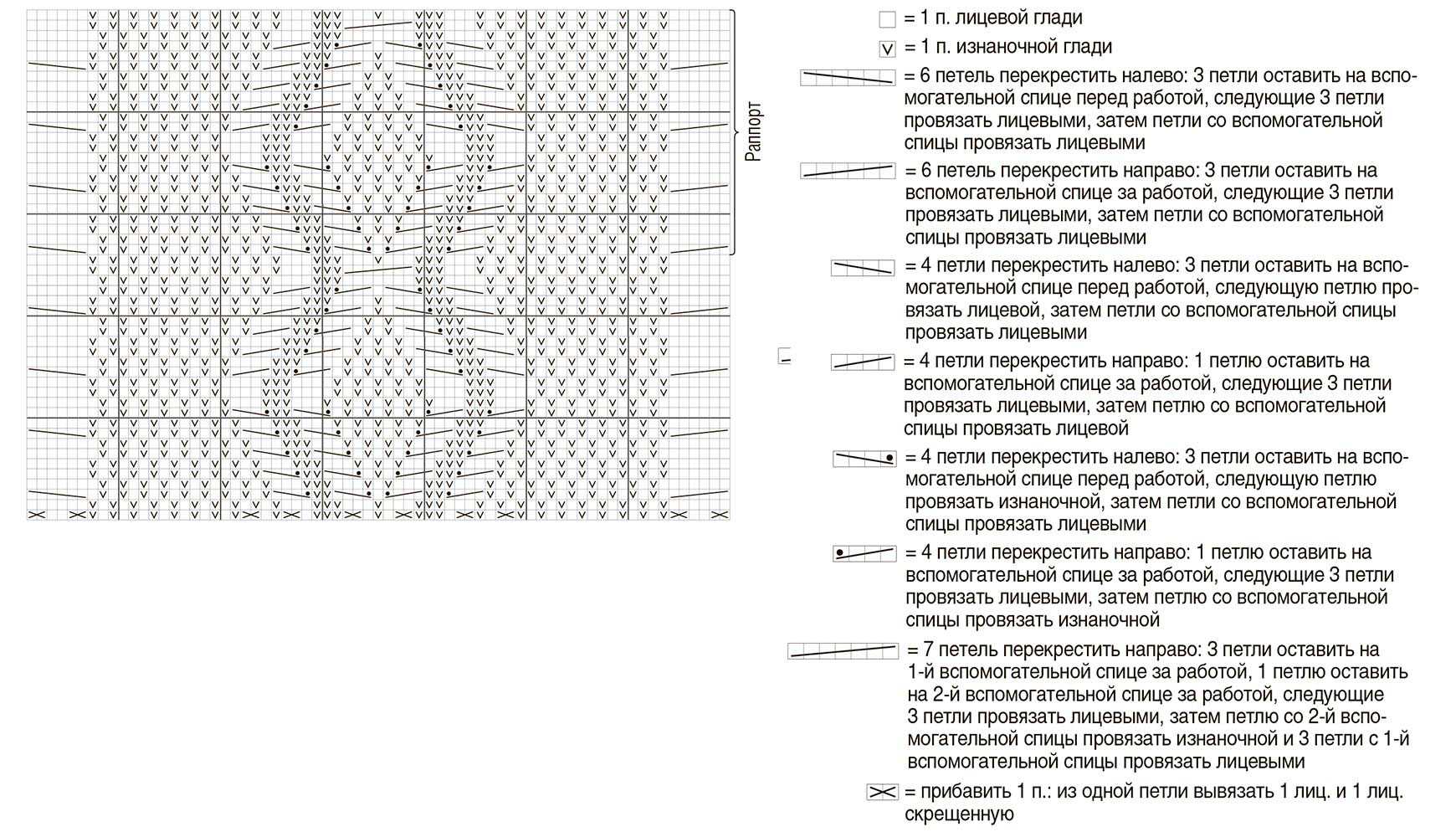 На ней даны нечетные круговые ряды. В четных круговых рядах все петли и накиды вязать лицевыми. Раппорт постоянно повторять.