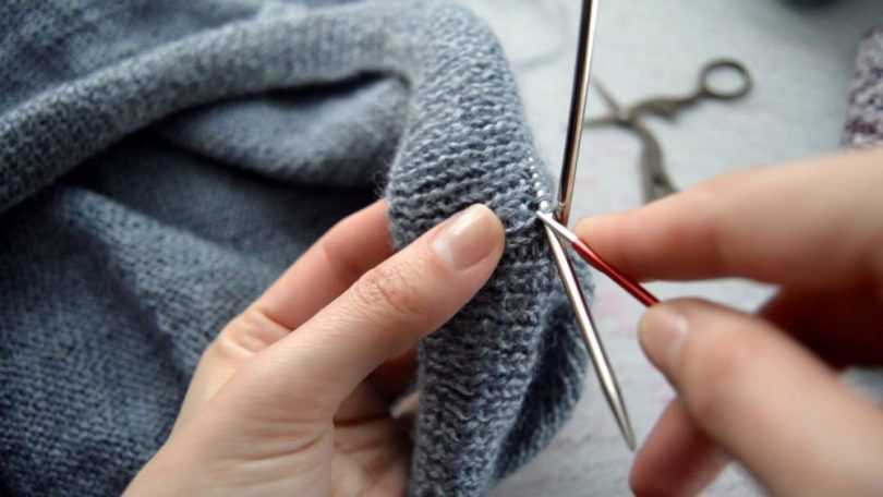 Сшиваем свитер и переходим к вязанию воротника. Его можно вязать как на круговых, так и на носочных спицах. Чтобы не было шва на воротнике, советую вязать его на носочных спицах. Набираем петли с булавок на носочные спицы, а там где нет петель – набираем.