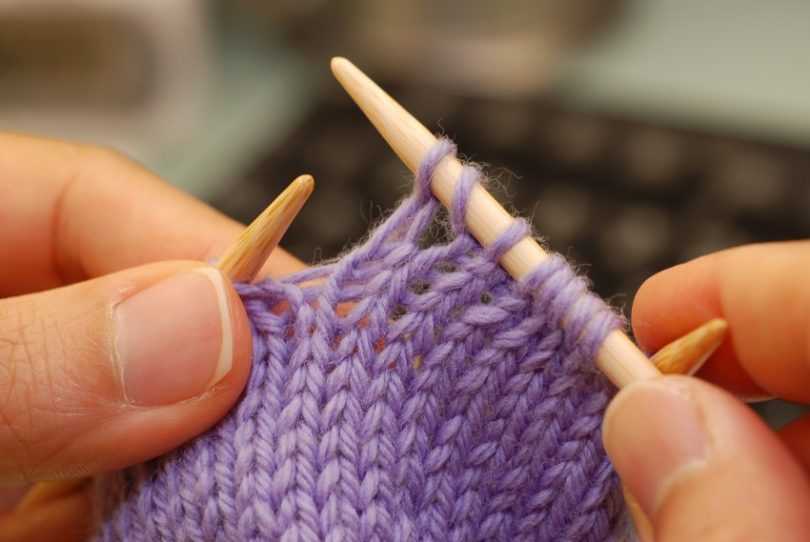 - Держа спицы параллельно, снимите 1 петлю спереди на спицу и 1 петлю сзади на спицу. Повторяйте последовательность весь ряд.