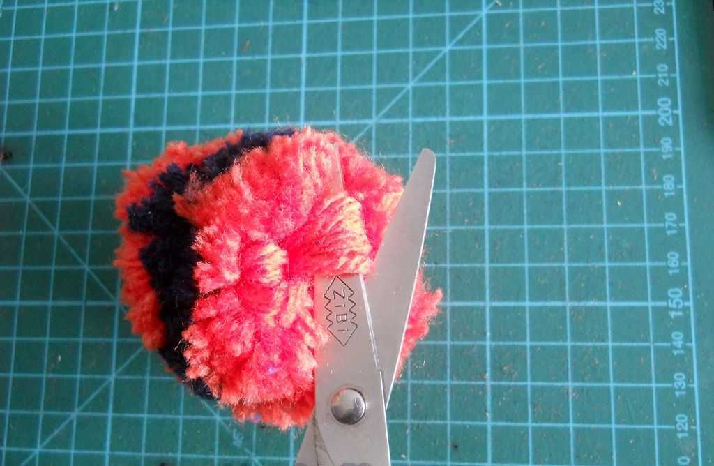 Потом производится выравнивание и фиксация основы будущего изделия. Потом разрезаются петли и расправляется основа. Выравнивание вдоль корпуса помпона производится также посредством использования острых ножниц.