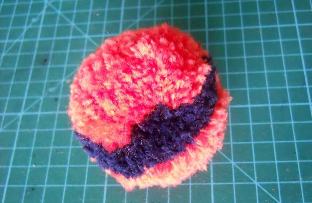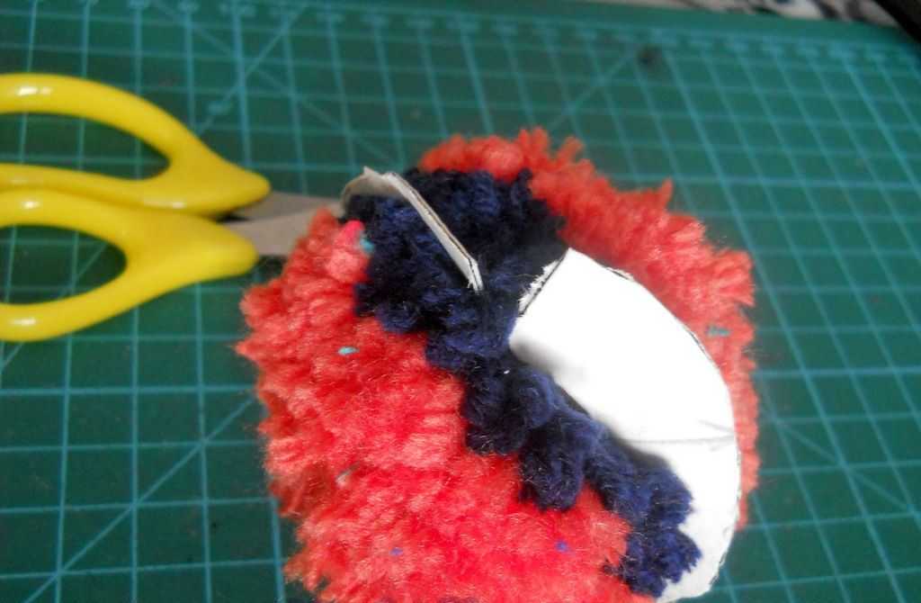 Если для помпона вы взяли очень большой моток пряжи, то разделите его на несколько частей, и смотайте в клубки, которые легко будут проходить в центр кольца. Концы ниток нужно подровнять по внешнему срезу, пока не сняты круги. Если вы хотите придать помпону овальную форму, его можно соответственно подстричь. Либо заготовку можно вместо круглой, сделать овальной.