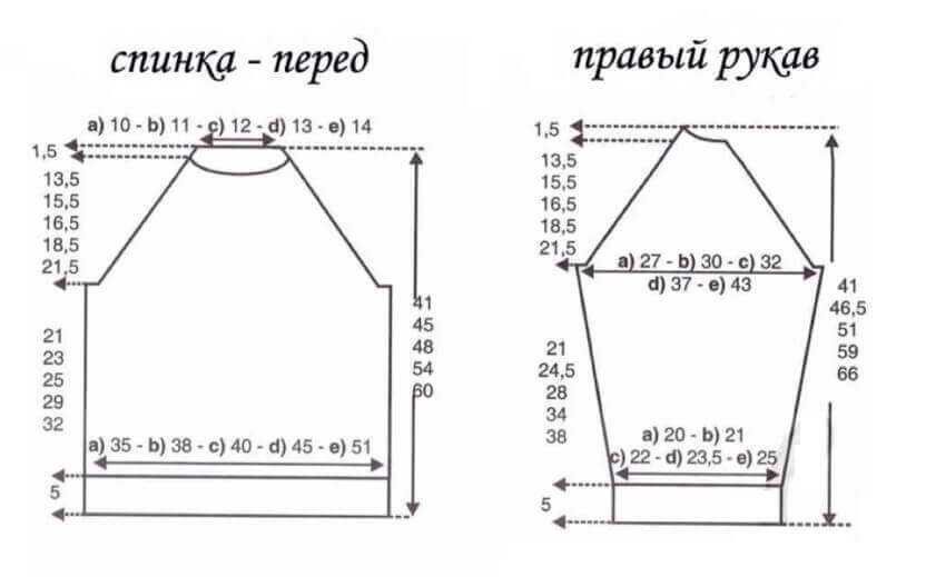 А расширение и формирование рукавов происходит за счет прибавления по 1 п. с обеих сторон рукавов. После образования линии реглана нужной высоты модель разделяется на детали — спинку, перед и рукава. Рукава вяжутся отдельно прямо без прибавлений и убавлений. А петли спинки и переда соединяются и по условной линии боковых швов происходит убавление петель, а посередине спинки и по наружным краям полочек выполняется прибавление петель.
