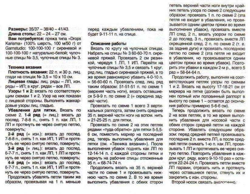 Размер данной модели – 42-43. Для вязания понадобится пряжа шесть/полиамид – 200 г, чулочные спицы № 4,5. Носки вяжутся в две нити.