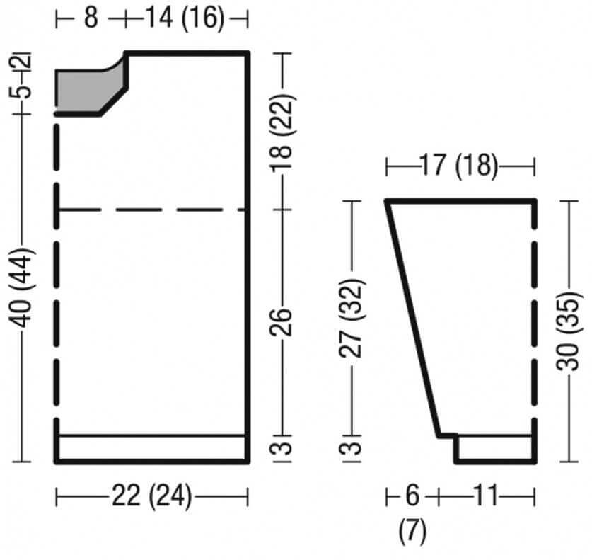 - Продолжать работу лицевой гладью, добавляя с каждой стороны от каждой регланной линии по 1 петле в каждом втором ряду. Так связать 14-14-15-17-18 см.