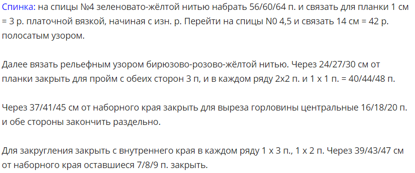 Приготовьте пряжу 200 грамм бирюзово — розово — желтой; 50 грамм зелено — желтой. акрил 50 %, хлопок 50 %. Спицы — 4, 4,5; круговые -4. Вяжем вязкой платочной — лицев. и инаночн. ряды — изнаночн петл.