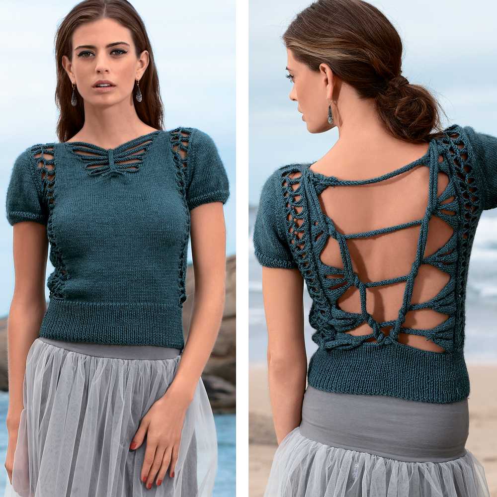 с открытой спиной – легкие блузы или кофты с прорезью на спине стали трендом нынешнего сезона. По мнению большинства женщин, такое изделие выглядит намного сексуальнее кофточек с глубоким декольте. Ассортимент включает изделия из шифона с воротником-бантом и трикотажные кофточки с округлым вырезом горловины и пуговицей на спинке.