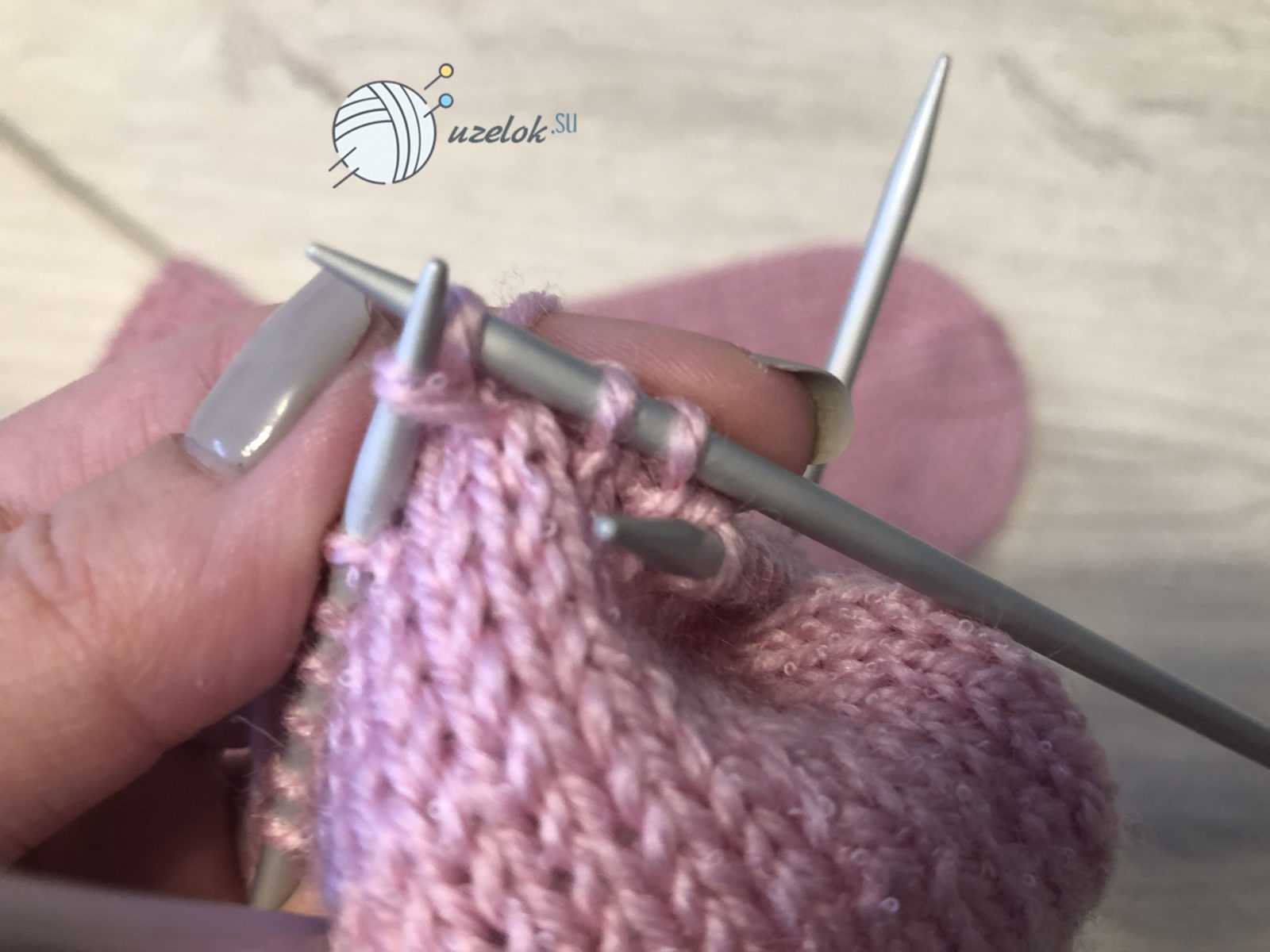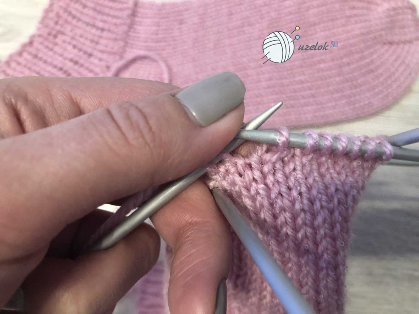 - 4 круговой ряд – 1 лицевая петля, снимаем 2 петли с правой спицы, переносим на левую спицу, провязываем совместно за задней стенкой петли, 1 изнаночная петля.