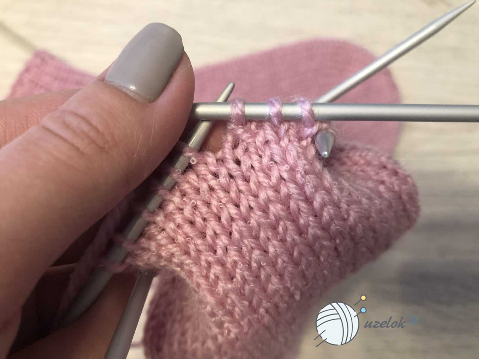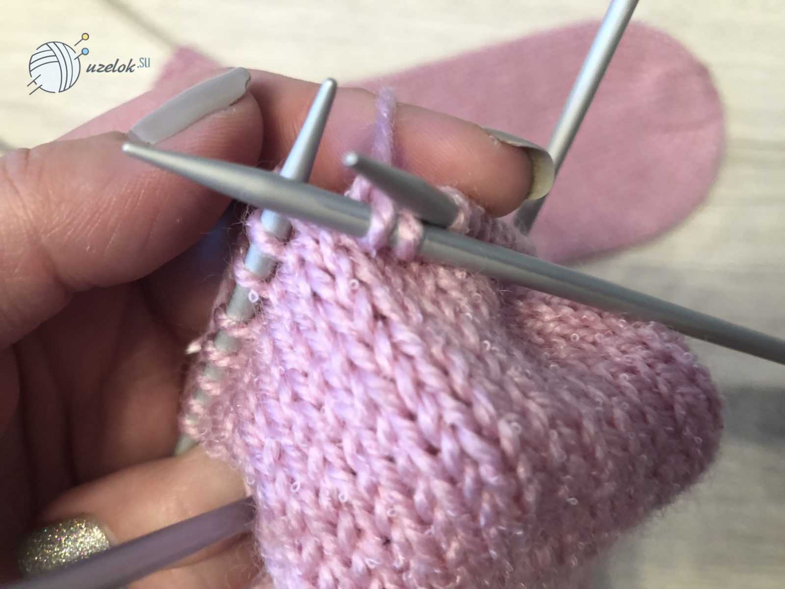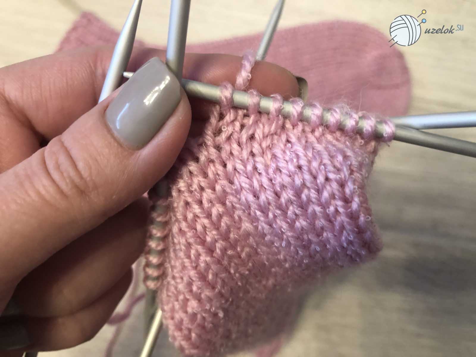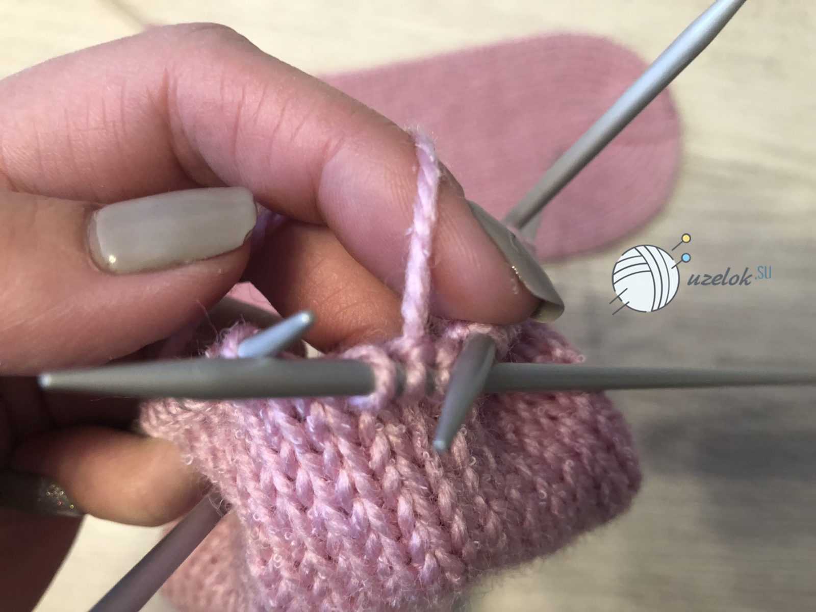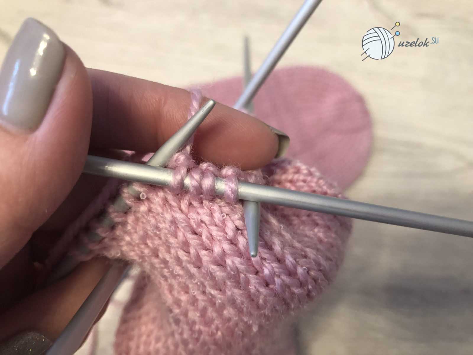 Для малыша в возрасте до полугода следует набрать на спицы 32 петли. Затем распределить равномерно на четыре спицы, по 8 петель на каждую. Сначала вяжется резинка — 2 лицевых, две изнаночных до 24 ряда. Далее с каждой спицы нужно убавить по одной петле. Для формирования пятки нужно будет объединить петли с двух спиц и вязать лицевой гладью восемь рядов. Затем 10 петель провязать лицевыми, убавив на 1 петлю, провязав две вместе. Перевернув вязание, провязать 6 петель изнаночными и также сделать убавление. Провязывается и делается убавление до тех пор, пока не спице не останется шесть петель.