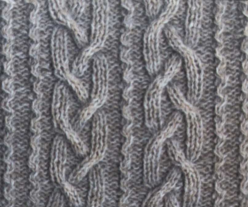 3-й ряд: 3 изн., 1 изн. петлю снимаем на вспомогательную спицу за работой, 1 изн., далее провязываем петлю со вспом. лицевой, 1 лиц. петлю снимаем на вспом. спицу перед работой, 1 лиц., провязываем петлю со вспом. изн… повторяем до конца ряда, закончив 3 изн.