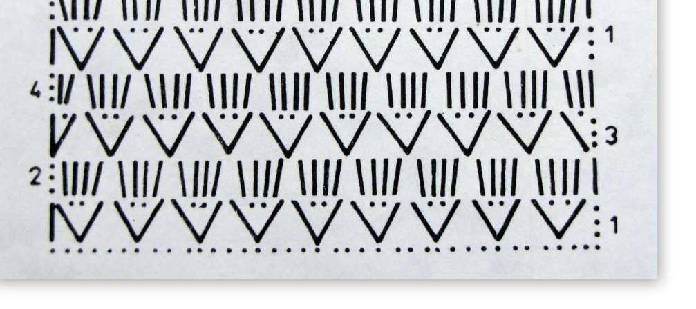 Вертикальный зигзаг зрительно удлиняет фигуру. Раппорт состоит из 14-ти петель в ширину и 16-ти рядов в высоту.