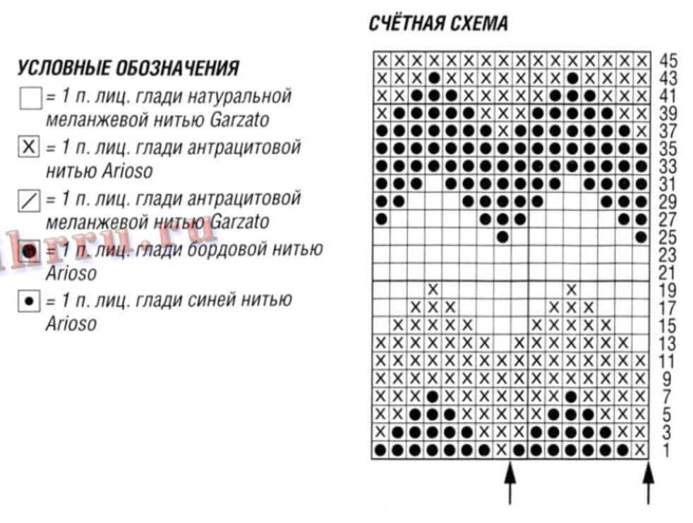 Здесь использована платочная вязка и узор с вытянутыми петлями. Стрелочки на выкройке – откуда начинать вязание.