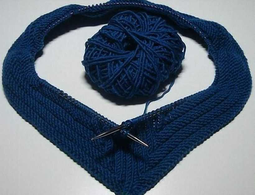 - Вяжем необходимую высоту оплечья. Можно связать часть манишки, закрывающую грудь в виде треугольника. В таком случае, основную часть манишки закрываем, а часть груди закрываем постепенно: по две петли с каждой стороны.