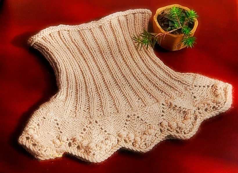 Совет: Если «шейка» манишки получается слишком узкой, а вязка – плотной, перевяжите. Можно оставить то же самое количество петель, но взять более толстые спицы.