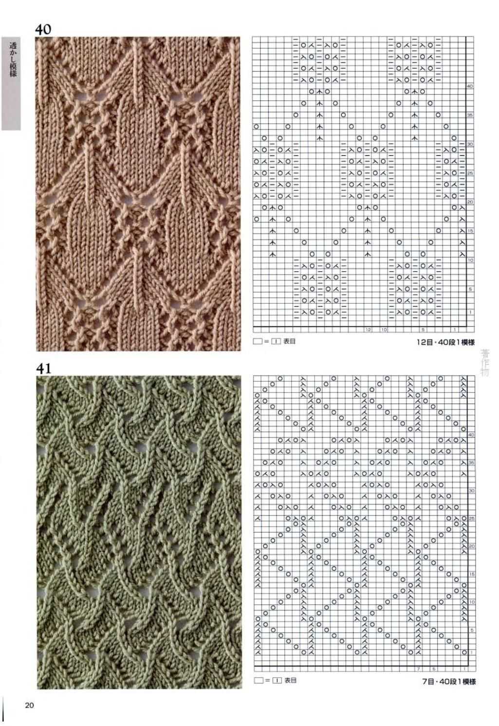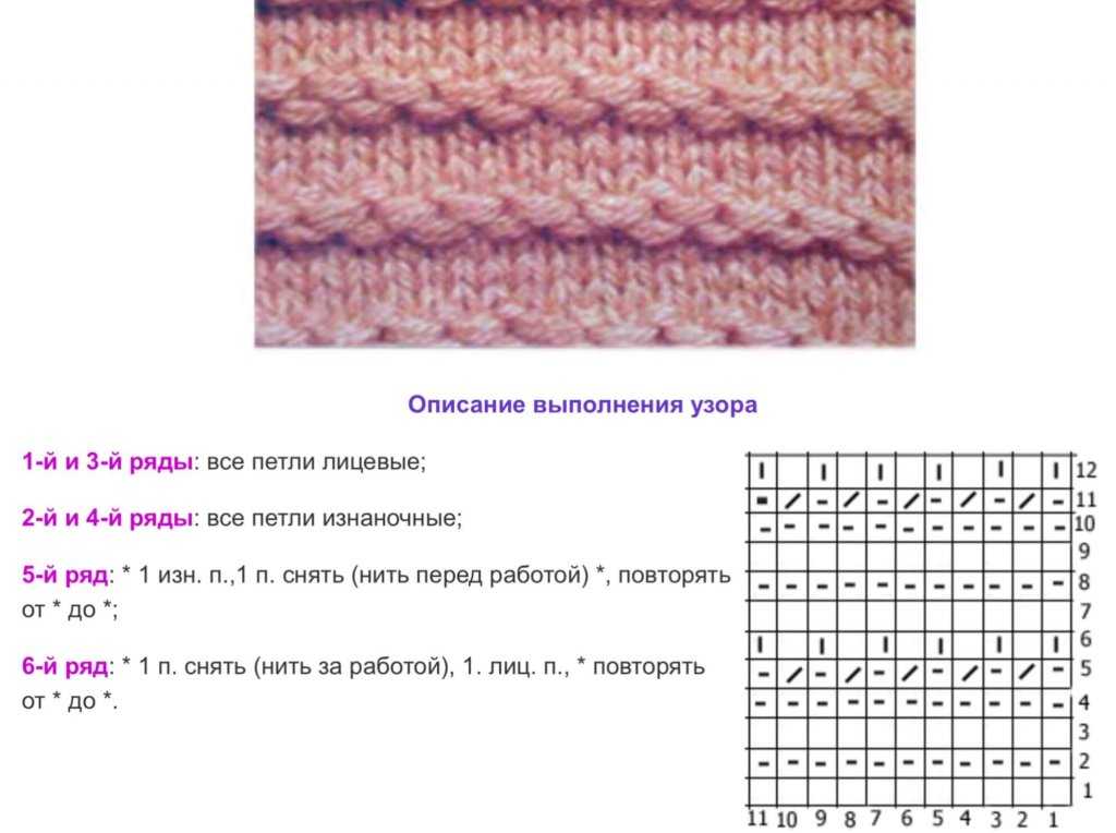 Приведенные схемы показаны для двух вариантов. Первый – наборный ряд из 40 петель, второй – из 60 петель. Выбор зависит от толщины пряжи и желаемой ширины. После выбора варианта и выполнения набора петель, провяжите 5-10 см резинкой 1×1, кромочные петли в лицевых рядах снимайте как изнаночные, а в изнаночных рядах провязывайте их изнаночными. Способ провязывания кромочных петель не критичен можете воспользоваться и другим.