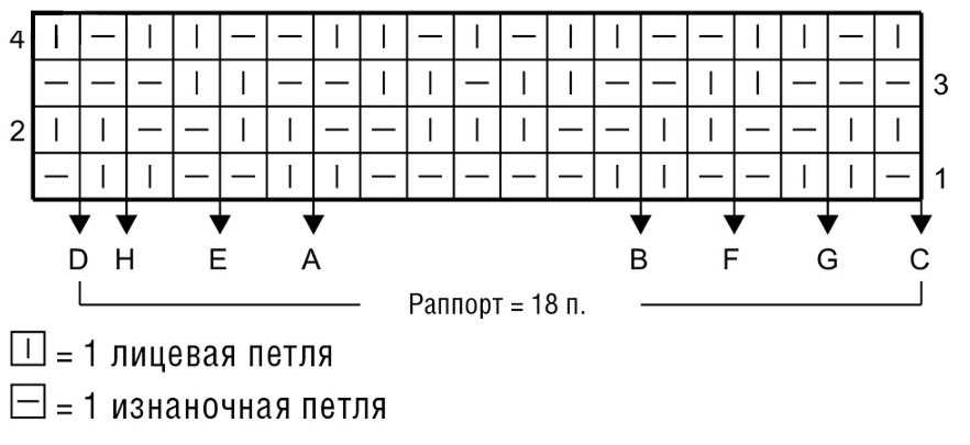 Лицев. р схемы считаем справа налево, изнаноч. р. считаем слева направо. Вертикальный раппорт (Р) узора состоит с 1р. по 4р.