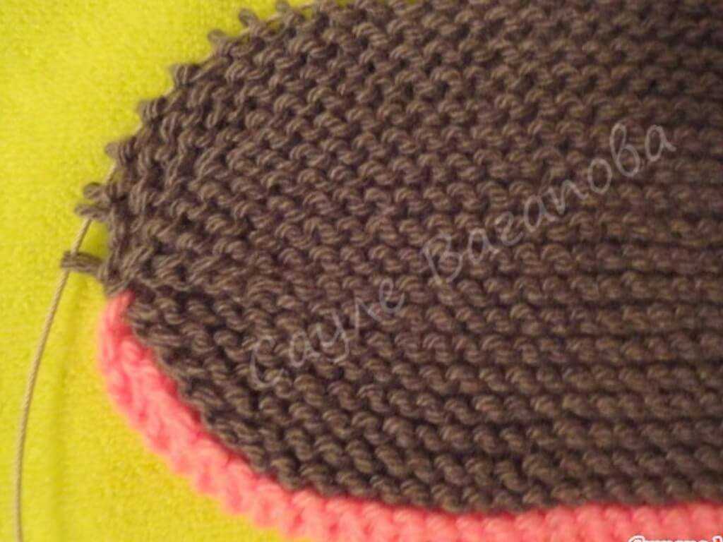 Дно выполняется лицевой гладью, а пряжа должна быть сложена в две нити. В процессе выполнения дна необходимо провязывать на лицевой стороне полотна по 2 П вместе ЛП, а на изнанке полотна по 2 П вместе ИП. Убавления делаем на длину 5 см, после чего последние П нанизываем на нить, и затягиваем. Теперь на м остается сшить шапочку по заднему шву.