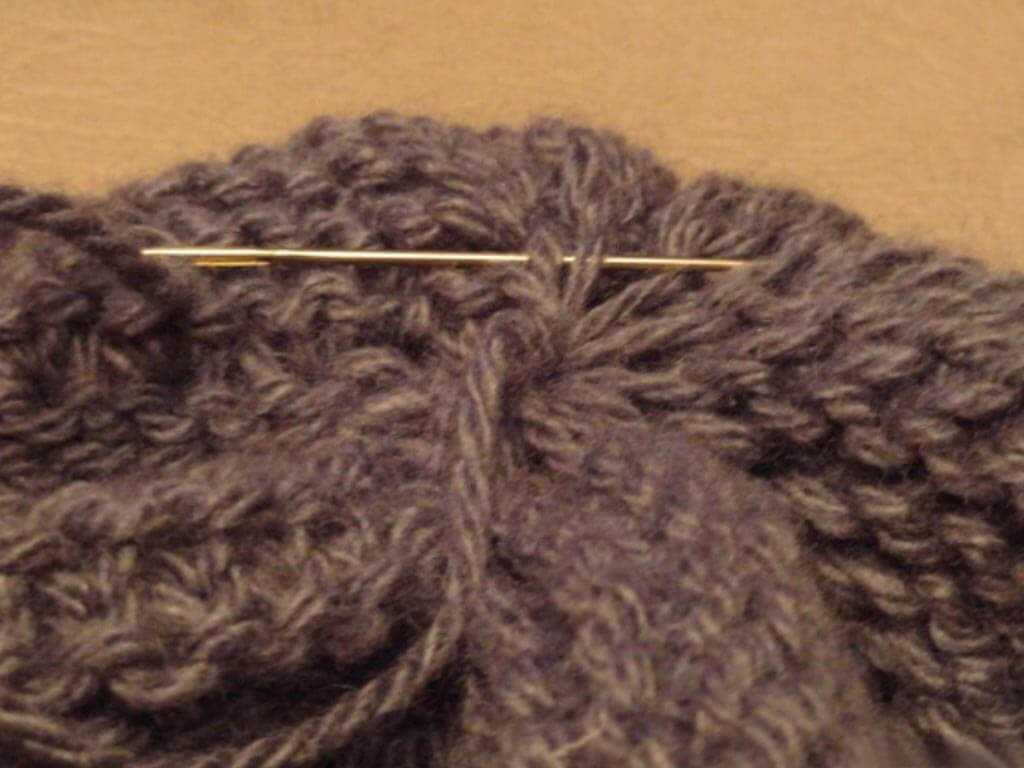 Переснимаем 6Л на чулочную спицу и 5И на шпильку. Шпильку убираем вовнутрь шапки. Тоже самое делаем второй раз.