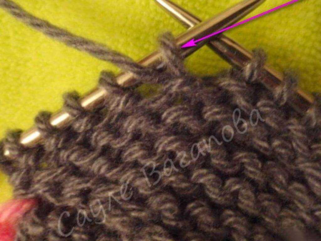 Далее, рабочую нить (стрелка на фото) завести вперёд, и вернуть снятую петлю на левую спицу.