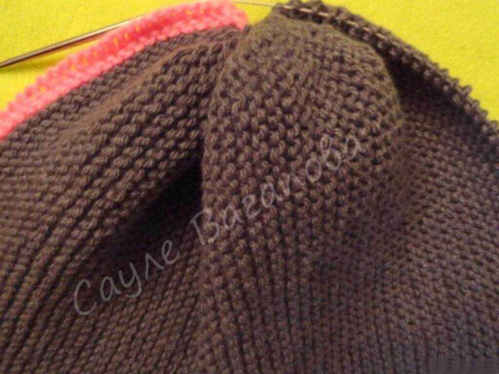 Условное обозначение: НК — накид. 1р.: (серая н.): 1п.платоч.узором * НК, снимаем 1п., 1лиц.*, НК, 1п.снимаем, 1п.плат.узором, поворачиваем изделие; 2р.: (серая): 1п.платоч.уз. * НК с петелькой провязываем сразу лиц., НК, петлю снять *, петлю с накидом вместе лиц., 1п.платоч. Сдвигаем изделие к другому концу спиц и вяжем с того же конца, как предыдущий р. 3р.: (секционная): 1п.платоч. * НК, 1п.переснимаем, НК и снятую п. вместе изнаночн. * НК, 1п.переснимаем, 1п.плат.в. Переворачиваем шапку. 4р.: (серая): 1п.платочная, * НК со снят.п.изнаночной, накид, 1п.переснимите * НК и снят.петли вместе изнан., 1 платоч. Передвигаем шапку на другой конец спиц. 5р.: (секцион.): 1п.плат., * НК, 1п.снимаем, НК и снятую вместе лицевой * НК, 1пет.переснимаем. Поворачиваем изделие. Повторяем только со 2-го по 5-й рядки. Не забывайте, что каждые два р. поворачиваем работу!