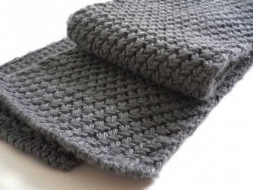 Еще один вариант простого узора для шарфа с использованием платочного узора. Шарф получается с выпуклой фактурой, хорошо держит форму. Узор подойдет для вязания мужских шарфов.