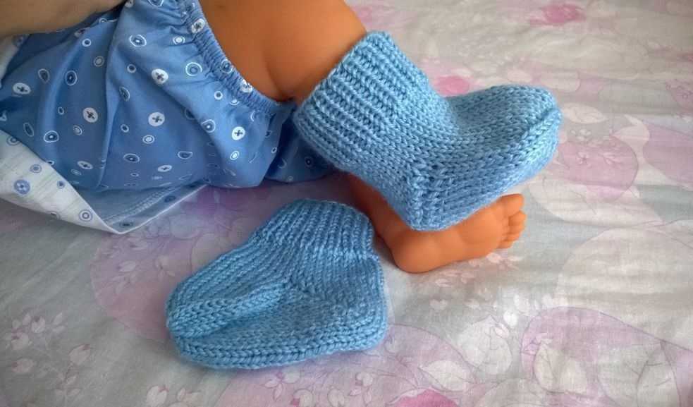 Для малыша в возрасте до полугода следует набрать на спицы 32 петли. Затем распределить равномерно на четыре спицы, по 8 петель на каждую. Сначала вяжется резинка — 2 лицевых, две изнаночных до 24 ряда. Далее с каждой спицы нужно убавить по одной петле. Для формирования пятки нужно будет объединить петли с двух спиц и вязать лицевой гладью восемь рядов. Затем 10 петель провязать лицевыми, убавив на 1 петлю, провязав две вместе. Перевернув вязание, провязать 6 петель изнаночными и также сделать убавление. Провязывается и делается убавление до тех пор, пока не спице не останется шесть петель.